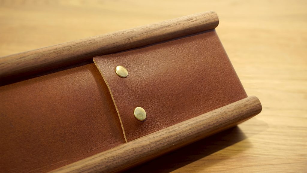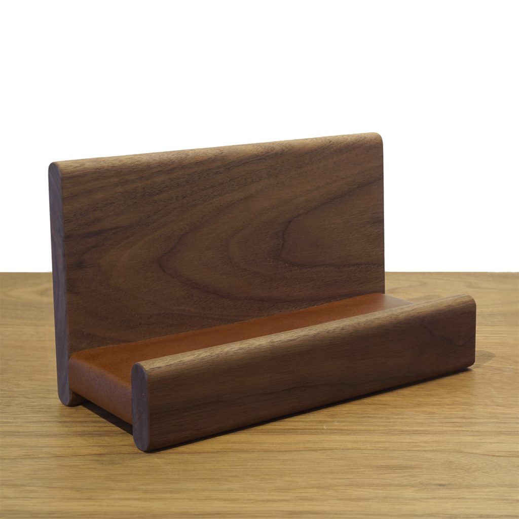 ウォールナットと本革パティーナレザーを使い、スマホやタブレットなどを置けるマルチスタンドを制作。