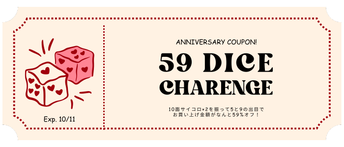 お買い上げ時に10面サイコロを2つ振って、5と9が同時に出たらお会計が59%OFF!