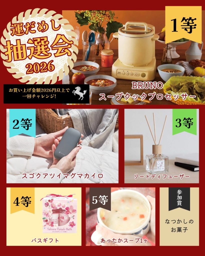 雑貨・アパレルを税込2,026円以上お買い上げで、1回抽選にチャレンジできます。