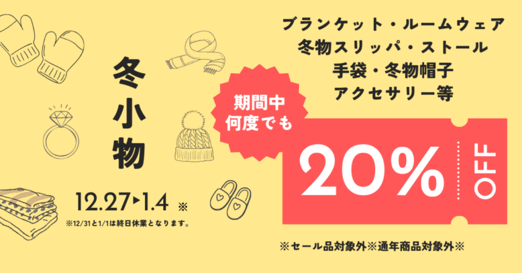 冬小物20%OFFクーポン【12/27(土)~1/4(金)】