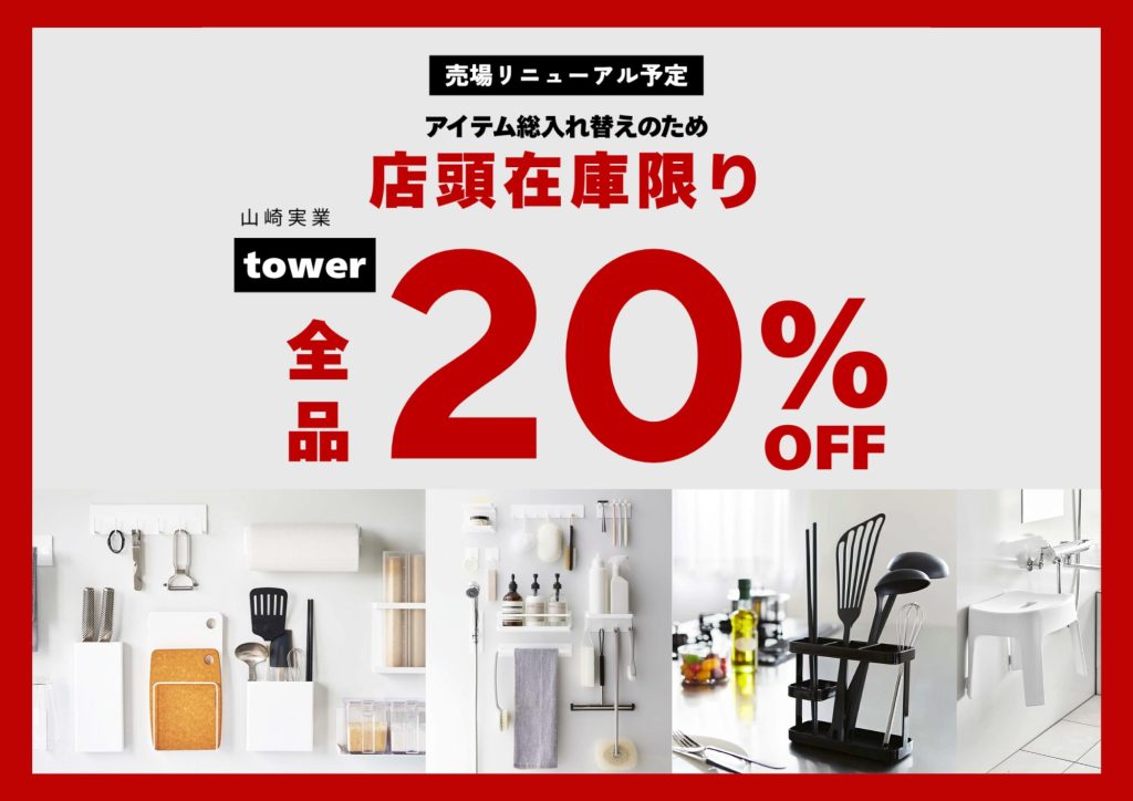 売場リニューアルのため、店頭在庫限りでtower商品が全品20%OFF。