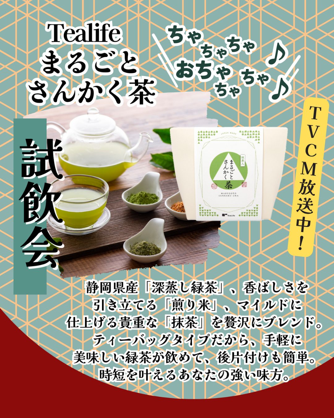 TV CMも放送中の、ティーライフ「まるごとさんかく茶」の試飲会を開催します。