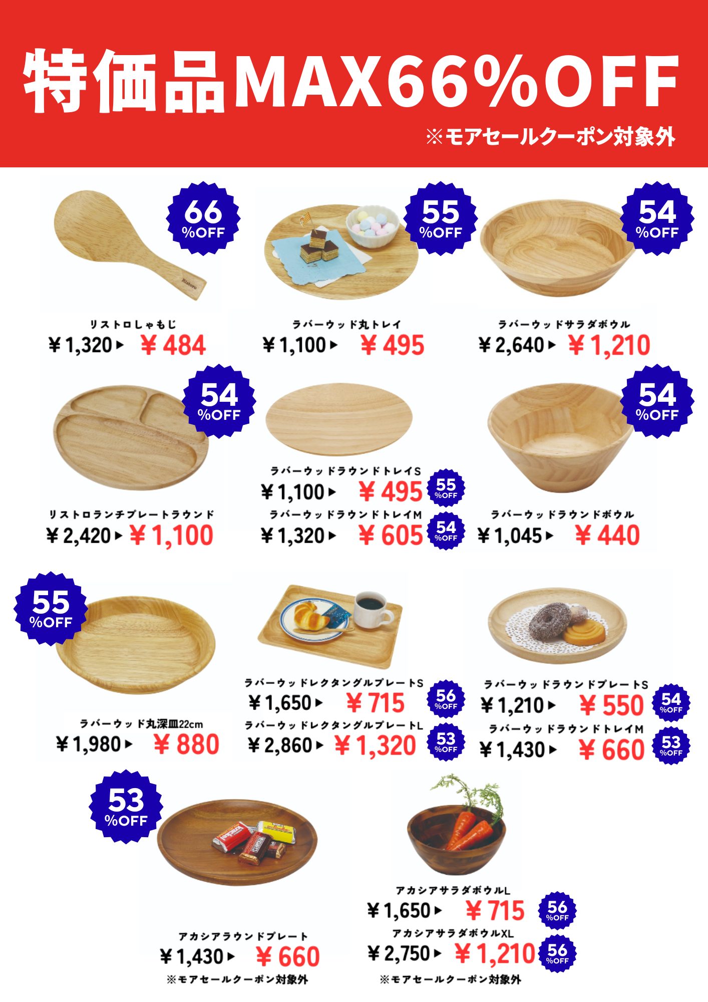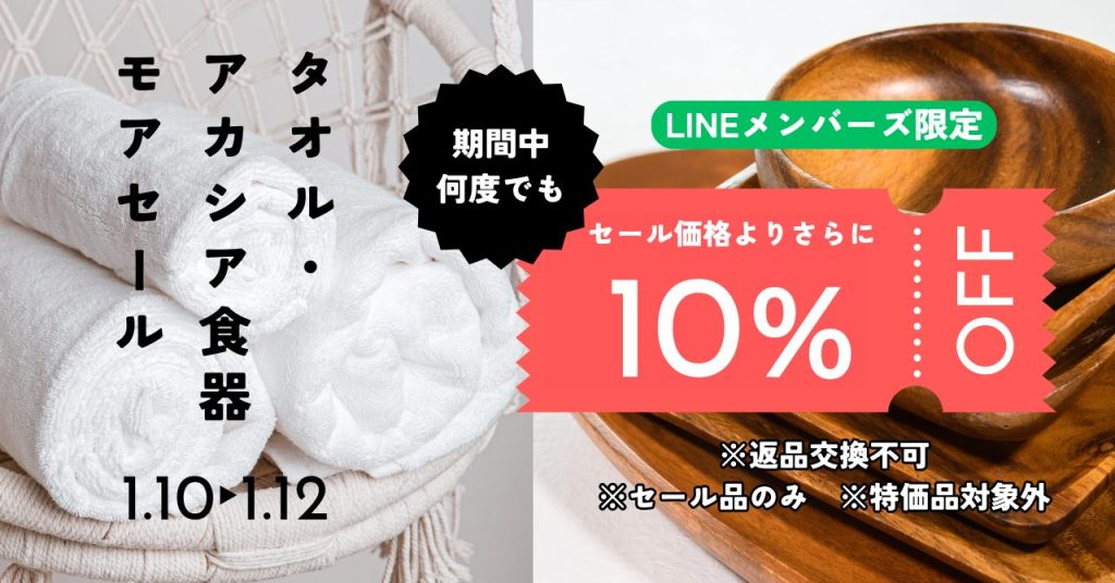 セールのタオル・アカシア食器がさらにお値引きになるモアセールクーポン配布決定!