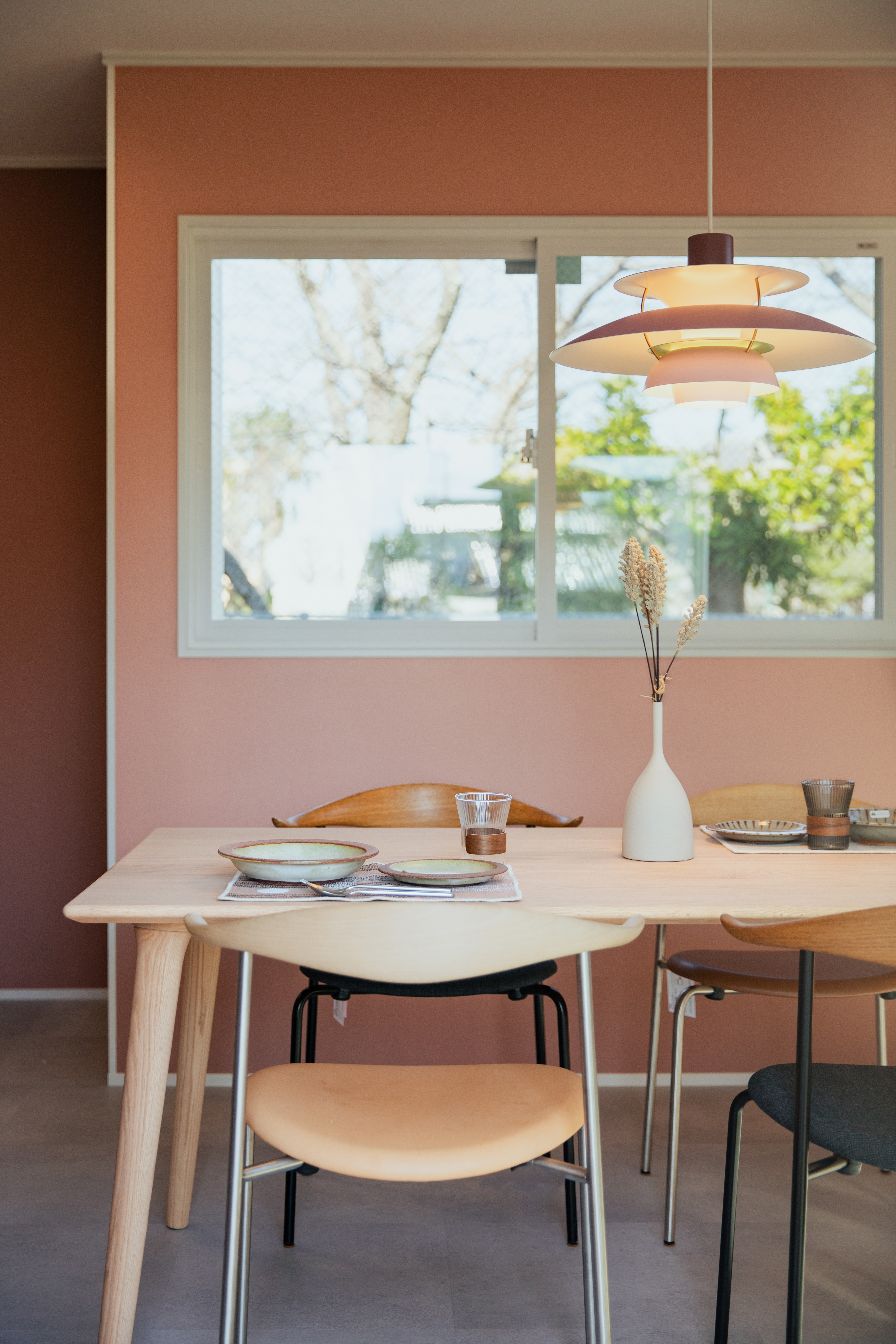 木の表情が美しいダイニングテーブルや、空間を軽やかに見せるチェア、