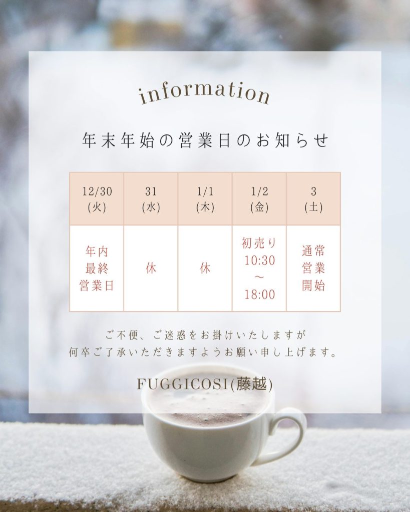 年末年始の休業日、営業時間変更のご案内です。・12/30 …年内営業最終日・12/31 …お休み・1/1 …… お休み・1/2 …… 初売り(10:30〜18:00)・1/3〜 …通常営業(10:30〜19:00... -